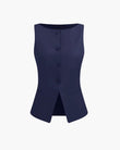 - Tailored Sleeveless Silhouette: Clean, collarless neckline with a front-button closure and subtle V-split hem for ease of movement