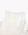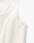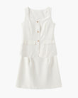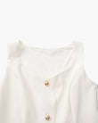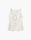 - Sleeveless Blazer Top: Scoop neckline, curved hem, gold button front, and mock flap pockets for structure